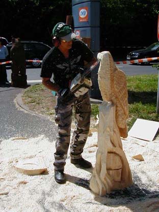 Es werden die verschiedensten Motive, kunstvoll, nur mit einer Motorsäge, aus einem rohen Stück Baum herausgearbeitet, und dies in atemberaubender Geschwindigkeit.