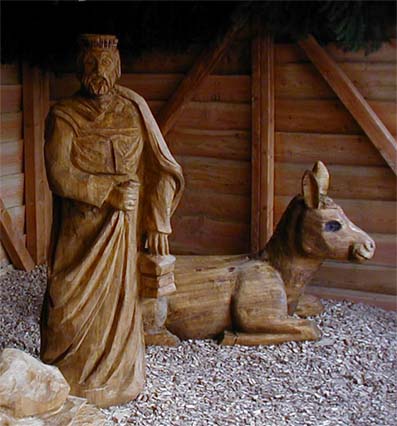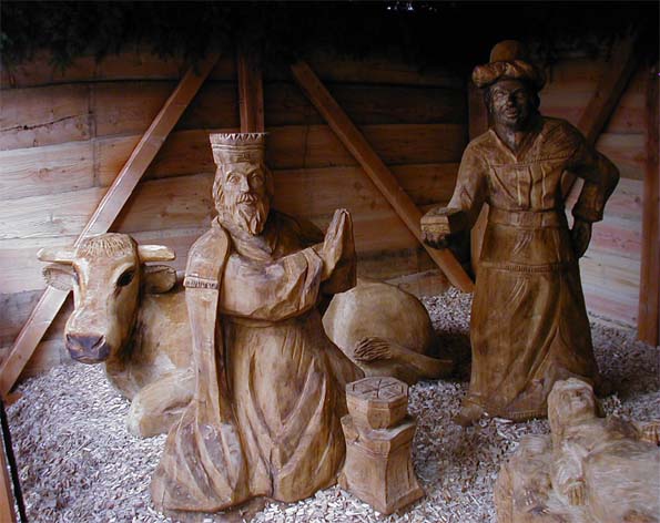 Weihnachtskrippe Krippenfiguren Weihnachtsmarkt Mosbach, Maria, Josef, Jesuskind, die drei Heiligen Könige, Ochs und Esel.