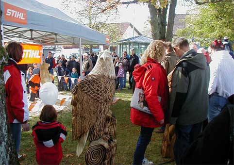 Es werden die verschiedensten Motive, kunstvoll, nur mit einer Motorsäge, aus einem rohen Stück Baum herausgearbeitet, und dies in atemberaubender Geschwindigkeit.