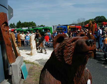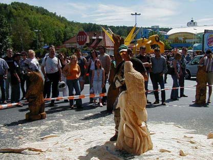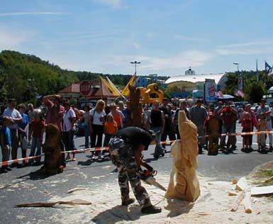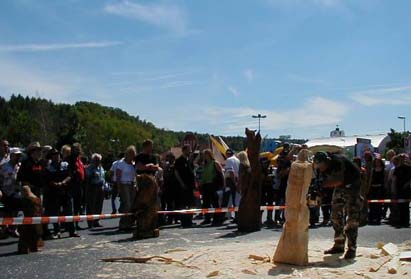 Es werden die verschiedensten Motive, kunstvoll, nur mit einer Motorsäge, aus einem rohen Stück Baum herausgearbeitet, und dies in atemberaubender Geschwindigkeit.