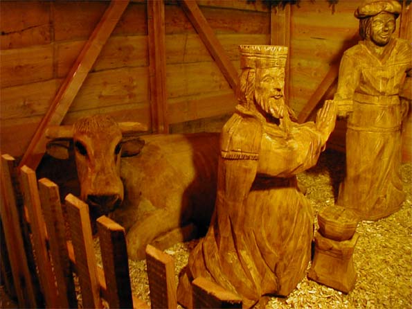 Weihnachtskrippe Krippenfiguren Weihnachtsmarkt Mosbach, Maria, Josef, Jesuskind, die drei Heiligen Könige, Ochs und Esel.