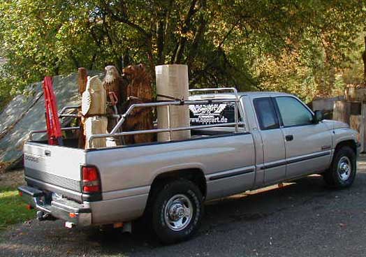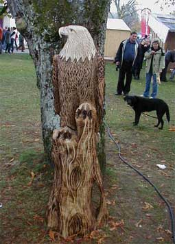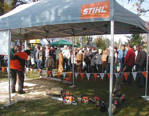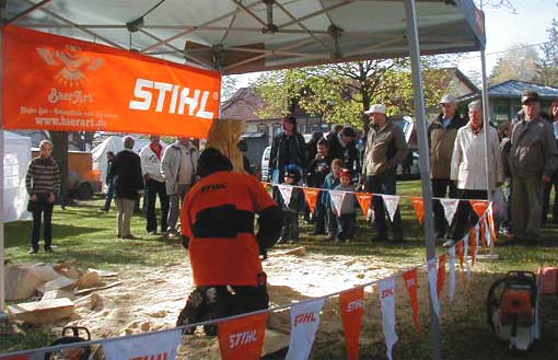 Es werden die verschiedensten Motive, kunstvoll, nur mit einer Motorsäge, aus einem rohen Stück Baum herausgearbeitet, und dies in atemberaubender Geschwindigkeit.