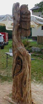 Wildlifetree mit Eule, Specht, Waschbär und kleiner Eule im Nest.